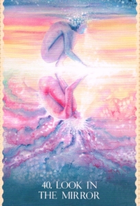 Embody the message of this card by looking into a mirror and expressing love. Even if you feel silly or awkward, touch your heart, look deeply into your own eyes, and say, “I love you, [your name].” Then touch your forehead and say it again. Repeat this (going back and forth between your heart and your forehead) until you believe yourself. Throughout the process, lovingly take note of any painful thoughts or feelings that come up.