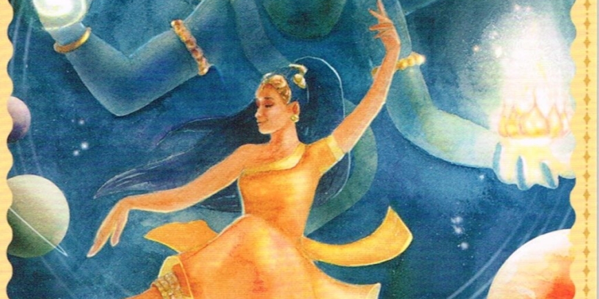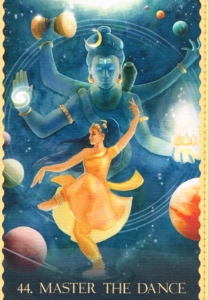 No embodied movement will bring you into harmony with the wisdom of this card quite like the Nataraja pose. This is the favorite pose of the Hindu god, Shiva, who is synonymous with both the Cosmic Dance and the vast, empty, open presence that underlies the entire manifest world. To come into Nataraja pose, balance on your right food and sweep your lifted leg across the midline of your body so that your left foot hovers a couple of feet from the floor on the right side of your body. While keeping your fingers tight together and your palm flat, hold your right hand to the outside of your right shoulder, about a foot in front of your body, with your palm facing outward. Cross your left arm across the midline of your body and touch the top of your left wrist to the bottom of your right wrist. Allow the left hand to dangle loosely. Hold this pose as you focus on a point in front of you and breath steadily for at least a minute. Feel yourself balancing, harmonizing, and coming into a state of immaculate focus and calm.