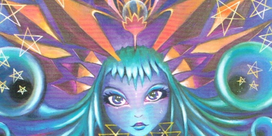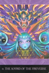 This card signifies those pivotal moments that transcend belief, remind us of a greater reality and influence us so that life will never be the same again. When I started channeling paintings, I explored sacred geometry by including it as a key element in my creations, without knowing much about its meaning. When I looked up the wisdom of the Sri Yantra, I was blown away. It symbolizes the sound of the Universe.