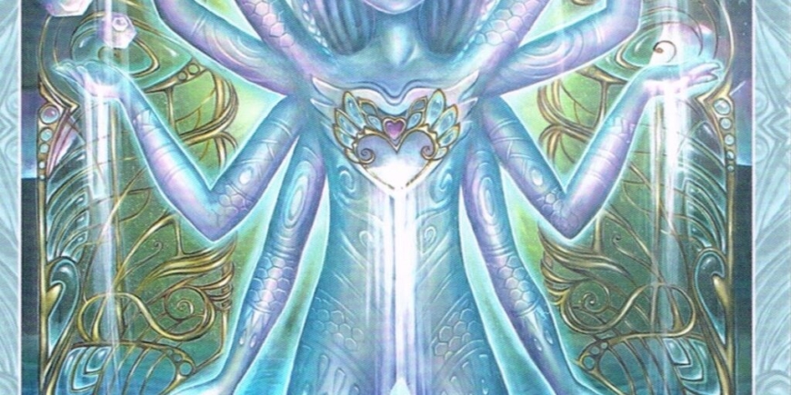 The being in this picture has many hands and yet still, the water is allowed to fall through her fingers. It blesses her in the moments it touches her radiant skin and then continues on its journey. Her heart is also overflowing, with love. Her eyes are filled with tears. She allows what comes through to move her, without control. She gracefully allows whatever she is feeling to be expressed and as she does so, she radiates so much light into the world.
