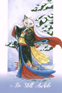 For now, dear seeker, even while you are on this adventure, the Kitsune ask you to consider that it is time to be still awhile. You have traveled far and experienced a great deal. Now, these wise foxes say it is time to rest and recuperate and be still, still as the earth beneath the snow, quiet s the seed beneath the soil, and allow the energy about you to be rewoven and reweaved, and the energy within you to be restored and received.