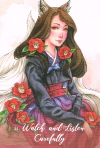 There is a possibility that you need to be cautious and careful at the moment-for what looks like a good situation, a friendly person, or an offer too good to be refused is disguised. There is no need to fear, but take your time and do not make commitments until you have investigated all that you can and received good advice from a trusted source. Kitsune, in the main, can be trusted, and this particular Kitsune is coming to advise you to take care, hold back, and think before you act. “Think” does not mean to worry or to fret, but to rely upon wisdom, rather than what you want to be true. Do not be naïve, do not act rashly and foolishly, and examine carefully what is before you. You may find that you will be very glad that you hesitated and took stock, rather than simply going with what you wish.