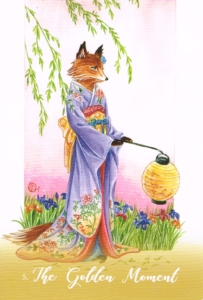 The Golden Moment occurs when, in one sublime convergence, all that has troubled you or caused hardship falls away, and the rewards of all that you have done simply are available to you, in a lovely time of wellbeing, good fortune, and joy. This is a very happy card, one in which we are filled with the light of possibilities, yet we are no longer under the strain of effort and the pressure of former days. The golden moment is to be felt and experienced, as it cannot be created or forced-it is akin to the energy of a holiday with friends, when there is true delight, a lack of complications, and an effortless ease. There is companionship that is soulful, emotional interactions that are true and without conflict and defense, and a sense of community and family around you. The whole world seems to be conspiring to make you happy-happy because you have an inner contentment, a sense of belonging in your own skin, and the people who you love, love you in return. There is a sense of flowering, growth, and coming to a kind of ripeness at this time.