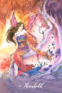 You are on the verge of a wonderful change. Youa re leaving one phase of life behind and entering into a new adventure of the soul. There is a sense of hesitancy about this card and the energy within you, but it is right and good to bid farewell to what has been and to stand in-between where you once were and where you are now going. You have auspicious adventures that lie before you, and the moment of change is upon you. What once was is now receding, losing its vibrancy and its life force, and what lies before you is the new and vivid tomorrow that will feed and enrich the depths of your soul. Take a deep breath, give thanks, and appreciate all that has been before-what we call the good, what we deem the bad, for they all have their blessings-and ready yourself for a step into a wild and beautiful unknown.