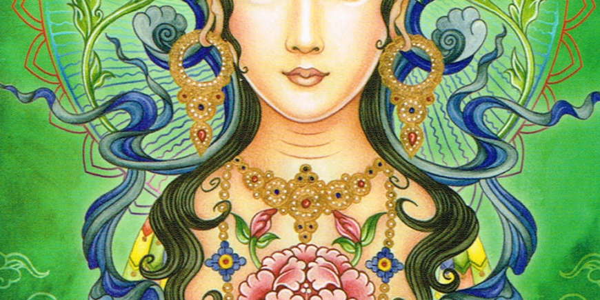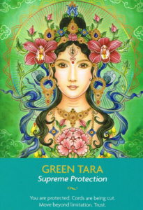 Legend has it that Avalokitesvara, the personification of perfect compassion, was looking down on the Earth one day and cried tears when he witnessed all the suffering in the world. When the tears hit the Earth, a lotus formed, from which Tara, the goddess of compassion and light, was born. She has many forms based on different colors and we have chosen green in this oracle because she brings a light of protection and safety with her. Always compassionate and loving, she helps us move into a new state of being and doing.