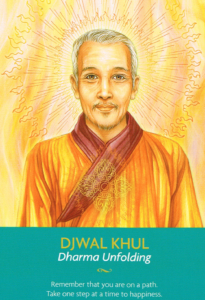 Djwal Khul (pronounced Dwaaahl Cool), known as “the Tibetaan,” is a Tibetan Buddhist master. He is said to have many incarnations, including as a devotee of Buddha himself and as one of the three wise men who honored baby Jesus. Through his earthly experiences, he has learned the importance of spiritual practice and discipline, and knows that the path we are on unfolds over time. He is now helping lightworkers follow their dharma, which is a Sanskrit word meaning “right way of living.”