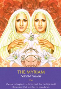 The Myriam, which means “the Beloved,” are twin flame angels who come as one. They are mirror images of each other. They are the angels who appeared to Mary Magdalene in the tomb of Jesus after his passing. These angels spoke directly to Mary and helped her move beyond her grief so that she was able to commune with Jesus once more. They can help us move beyond the cloud of grief, too. The heal grievances of all kinds, including ones that have been created by religion or the idea that God does not love or accept us because of a mistake we once made. The Myriam help us remember that we don’t need to ask God for forgiveness because “he” never condemned us in the first place.