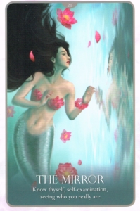 Divination: It is time to gently, yet firmly see the truth about who you are, and to understand that who you are is not ugly, or lacking, but a truthful, beautiful, wonder-laden voyage into the soul…it is time to be shown what the eye cannot always see, but what the spirit has sensed…this may come through observations-loving words from friends whoa re truly able to see you, from a stranger who notices something that too many overlook, or it can come in a moment when you glimpse who you have become…dreams, visions, and flashes of intuition are also the mirrors that work with us at this time. Mirrors and who you appear to be will be coming up for you. Be sure to embrace the mirror and the magical mermaid’s tool as an ally, and wonders and healing will unfold.