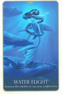 Divination: It is time to allow yourself the freedom to feel-to express those feelings. This will release and let go of some of the weight you have been feeling, that may have actually manifested and physicalized in more weight on your body, a sense of discomfort when moving, less flexibility and a feeling of being clumsy at times. This re-involvement with your emotions can also be nurtured by allowing tears to fall, connecting with your own inner sea, and if you are a woman, by connecting with the womb. If you are a man, you may develop a new appreciation of the feminine nature-and of your own emotional wisdom. Men and women alike who receive this card may wish to spend more time in healing, natural bodies of water. The weight of your form that you experience on land will vanish and likewise, you will release any worries, your deep sadness and that sense of being overwhelmed that you so often experience. The freedom of water can be yours, emotionally, physically, and your spirit will take underwater flight!