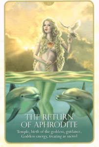 Divination: when Aphrodite comes to you from the sea, you are being reminded of your deep, delicious nature, the power of sensual desire, and the holiness of laughter and delight. There will be female friends who encourage you to remain free, and to find out for yourself what it is you want, and who will praise you and assist you…it is a time of being reborn into your sensual self, and all that you are as a woman-your yoni, your body, your breasts and hips, all are now greeted and claimed, reclaimed with love. You see that you do walk in beauty, and that many have seen you coming from afar, and have desired you. There is no sin in this. Aphrodite loved beauty, too, and knew how to share with other women-gifting her magic belt to Hera for a time to help her with her faithless husband Zeus, or sharing Adonis for half the year with youthful, irresistible Persephone…she is not the same as others. She does not wish to “have and to hold.” She wishes to experience, to love, to be filled, again and again, with all the beauty this world has to offer. But she never wishes for ownership. All is Golden; everybody is in Love, for a magical time, because the Goddess has returned.