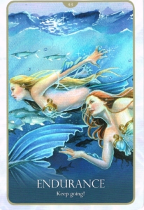 The Mermaids Sing: When a long journey begins, or when aa quest is undertaken, be it a pilgrimage, or an ambition or a desire, or a dream that you wish to create in this earthworld you live within, human one, there is the excitement of the beginning…the unknown still lies before you. And it is a thrill, every moment, to take another step forward. But at some stage, just as we tire, you too tire. The terrain can become unfamiliar. Issues arise, challenges greet you, and at this point, too many of you feel that this must NOT be meant for you-for you have told yourself that if it is truly meant to be, it will be simple, it will flow, and it will be…well, easy. We are here to share that for all creatures, and in both the seen and the unseen worlds, there are parts of the great journey that require our stamina, our courage, and our endurance-our ability to commit, and to stay with the task and dream and promise until we have made it. Do not enter into agreements lightly-enter into them, if at all, wholeheartedly. And be prepared to develop your strength and tenacity, your courage and your honor along the way. Without what you describe as a challenge, there will be no growth. If you work through and into and with the challenges, you will emerge stronger, and more able to realize the next dream. Flee at the first sign of difficulty, and you will be what we call a shore-hugger-one who never goes deep, who only goes to the places they know. There may be nothing wrong with this. But if this card has come to you, you have sent out the request to the great ocean mother to go on this great journey, to take on a mission. And the time has come for you to build up your endurance. Commit. Practice. Trian! We do, although most often you will only hear tales of our beauty and vanity. How else do we live so well within the great power of the ocean? The answer for us, and for you, is that we develop our power-and we endure, when others would give in or turn away. We are stronger than that. And so are you!