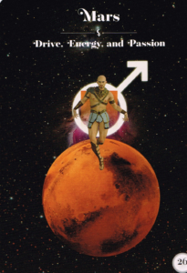 Mars is the cosmic divine masculine and loves t initiate action, lead, compete, and come out on top. If you have felt stagnancy in your life, this card indicates that a breakthrough is imminent. When Mars is present, the universe is ready for you to move forward. A supportive masculine figure could also be coming into your life to assist you. One caveat about Mars energy: the need for dominance and power struggles can come up now. Remember to practice patience.