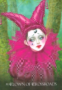 The Clown of Crossroads card comes to you when you are at a choice point, a time for you to make a decision and realize that your life does not have to continue on as it has been anymore. You are at a pattern-breaking, life-changing moment, or soon will be. Of course you can try to continue with the status quo, keeping things the same as they are now for as long as you can. However in doing so, you will be saying no to the pathway opening up for you, leading to a different life ahead. In nature, all things must grow. What is suitable for one phase of development might be unduly constraining or inadequately stimulating for the next phase of growth.