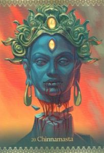 Chinnamasta is potent medicine for liberation. Her graphic iconography differentiates her from other forms of Kali that wear her favorite accoutrements of severed heads and skull garlands. Chinnamasta’s severance is of her own head. This represents self-liberation. We do not need to wait for another to intervene. She shows the way to save ourselves, to move from inner courage and inner wisdom. Her presence can indicate a time when you must trust yourself completely, without external support systems to rely on. The beliefs and constructs that once supported you will no longer be able to do so. Success cannot come from the tried and true paths of the past. You are evolving beyond that. It is time to rest in the void and allow for a new way to emerge.