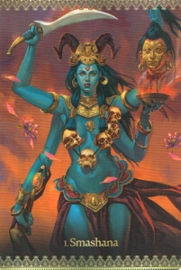 Smashana can appear when we are in difficult times due to the loss of a loved one or the failure of something we had counted on, or even a more subtle, inner experience of an ending we cannot link to an external event. Her presence is an indication that life as you have known it will change radically. This can be a welcome release from difficult times and prolonged cycles of suffering. Smashana is not quiet and subdued in the cremation grounds. She is wild and vital. She brings energy and aliveness to situations where there would otherwise be none. She brings about an end to stagnation that has been depleting your life force.