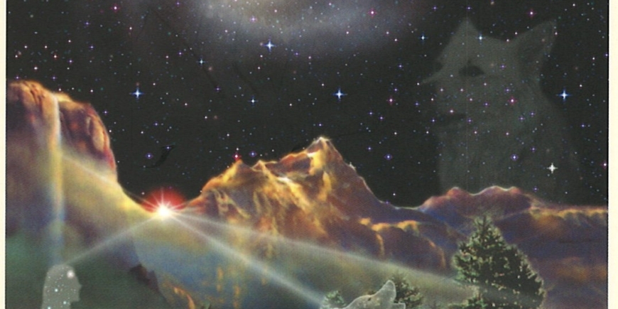 In front of you is a spinning galaxy. As you step into it, misty and magical light swirls around you, lifting you onto Bifröst, the fiery rainbow bridge of Norse legend. Notice a wolf sitting next to you. This is your animal totem, a companion for your journey, here to invoke your instincts, personal power and self-control.