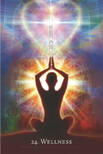 Place a hand on the card. Ask the Flower of Life in the image for inspiration toward new ways to create with your body and life. Close your eyes, slow your breathing and sense your body. Imagine your breath carrying your awareness into a deeper connection with your physical body. Notice any twitches, itches, tightness or soreness, and observe where in your body this occurs. Are they telling you something? Focus on your body for at least thirty seconds. When you feel ready, imagine golden light pouring through you into the earth. You are grounded and centered. Breathe this wisdom into your life. Then, open your eyes and feel how good it is to be in your body.