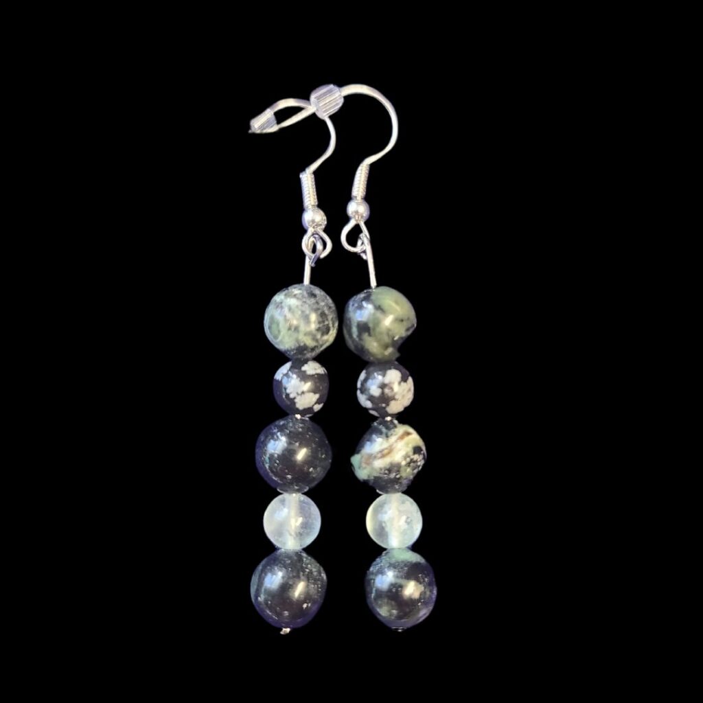 Balance Me Earrings made with kambaba jasper, fluorite and snowflake obsidian beads.