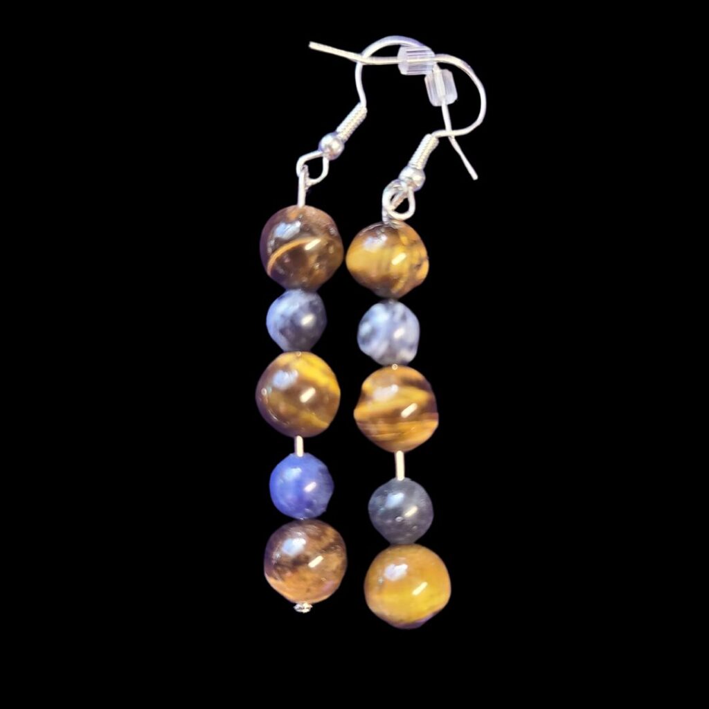 Bring Me Clarity Earrings made with tiger eye and sodalite beads.