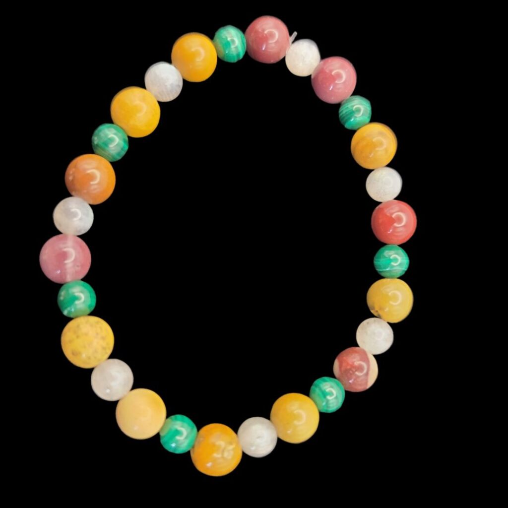 Calm Transitions Bracelet made with mookaite jasper, malachite and labradorite beads.