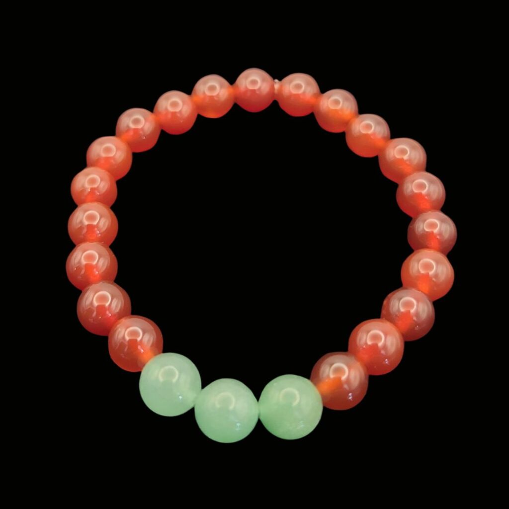 Bracelet made with carnelian and green aventurine beads, approximately 8 inches.