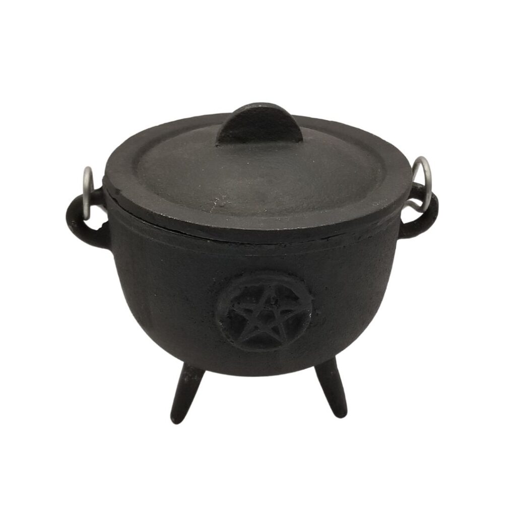 4″ cast iron cauldron with lid, pentacle symbol and sand.