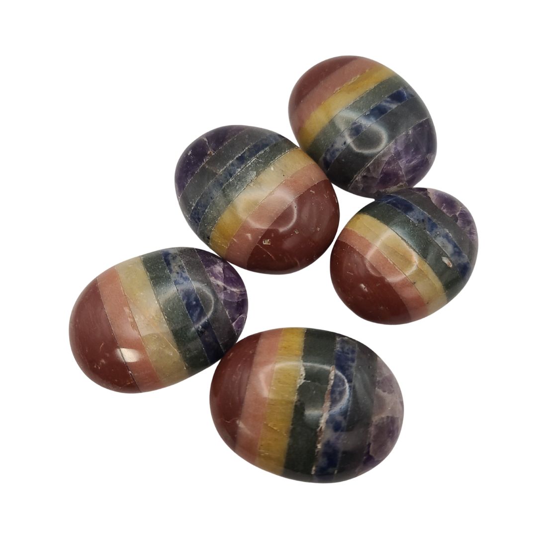 The Chakra Palm Stone is intended to help balance the primary seven chakras. They contain red jasper, carnelian, yellow jasper, green aventurine, lapis lazuli, black agate and amethyst.
