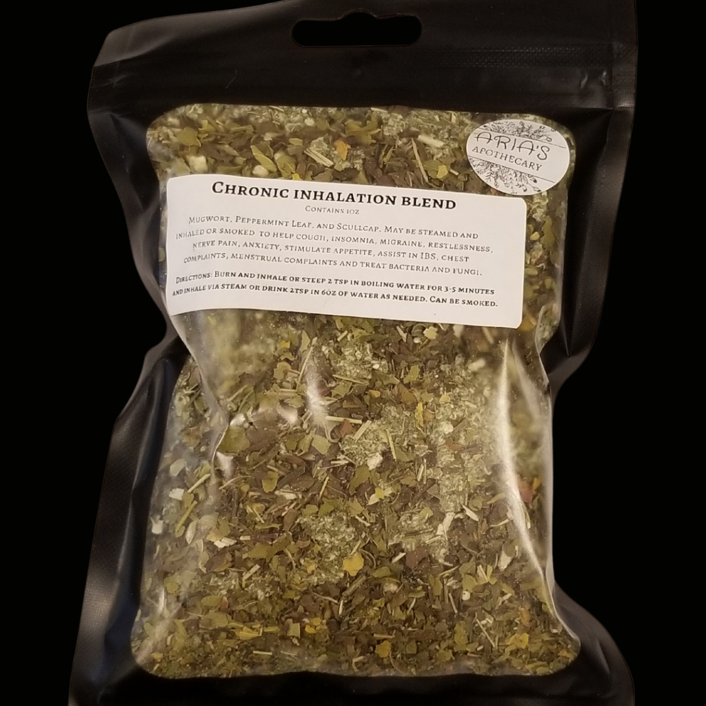 Aria’s Apothecary chronic inhalation blend, 1 ounce. Steep 2 teaspoons in boiling water for 3-5 minutes and inhale via steam. Other options are drinking 2 tsp. steeped in 6 ounces of water. This blend is also smokeable.