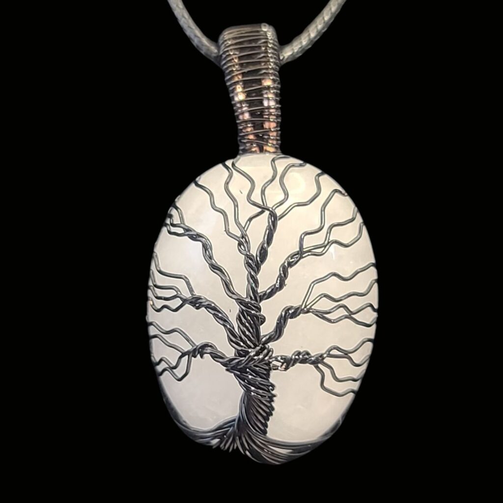 Clear Quartz cabochon stone wrapped with a black tree of life. All tree of life pendants will come with an adjustable cord. The cabochons are 22mm x 30mm.