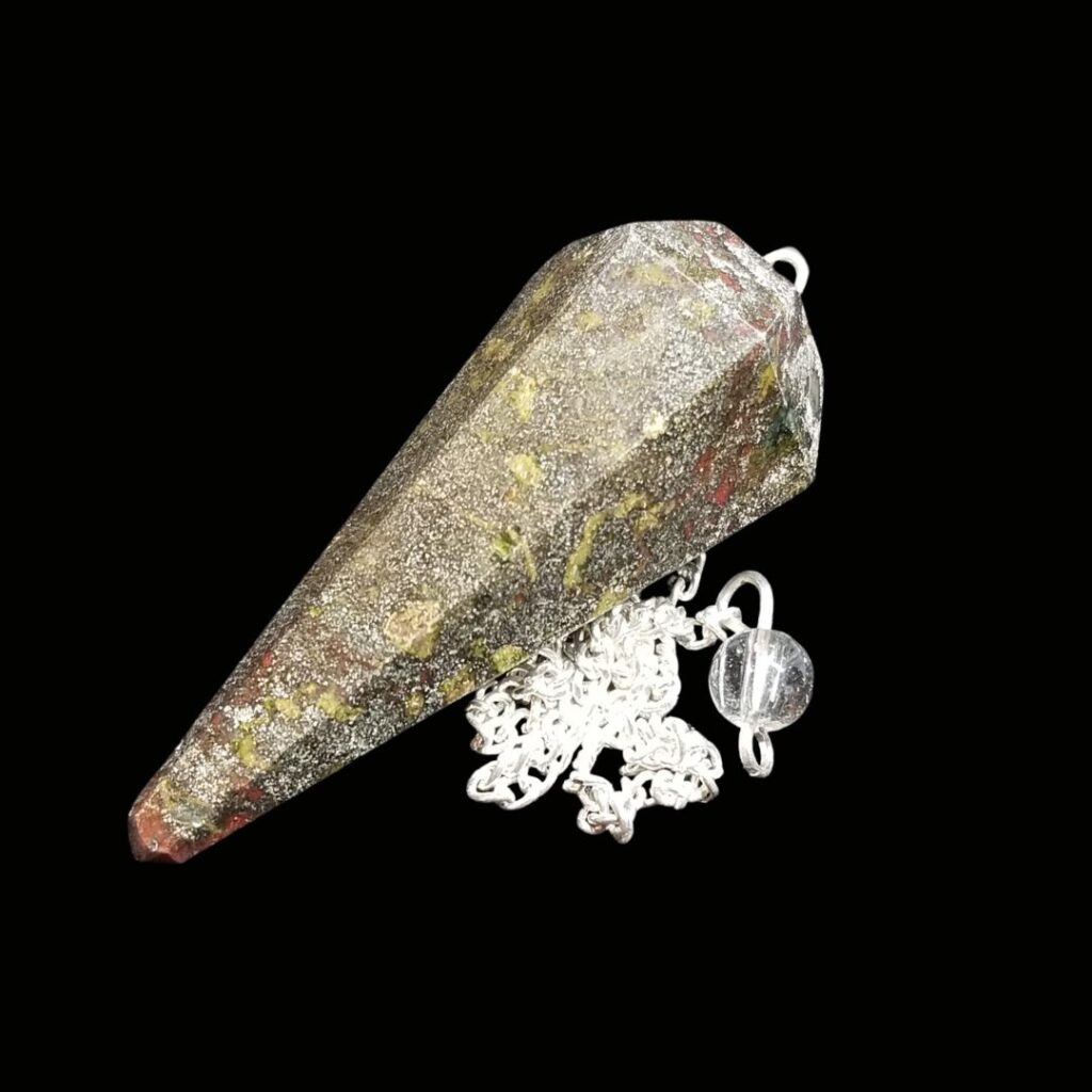 Dragon Blood Jasper pendulum, approximately 8″ from tip to tip.
