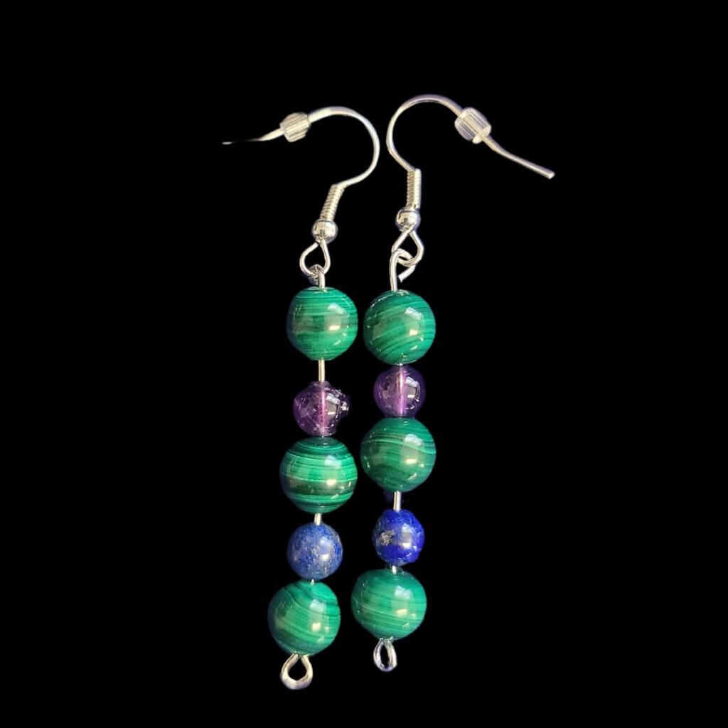 Feel It Earrings made with malachite, lapis lazuli and amethyst beads.