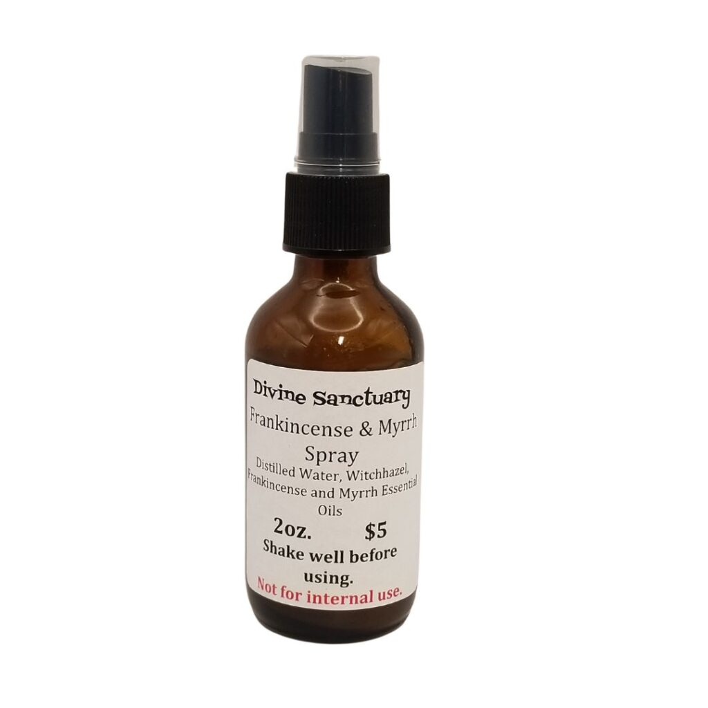 2 fluid ounces of frankincense and myrrh spray made with Frankincense and Myrrh essential oil, distilled water, and witch hazel.