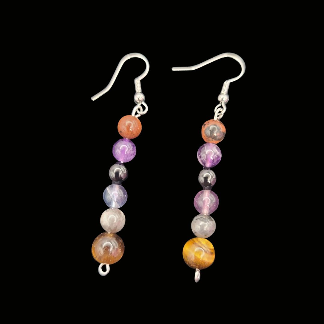 Healer Earrings made with tiger eye, labradorite, fluorite, black onyx, amethyst and mahogany obsidian beads.