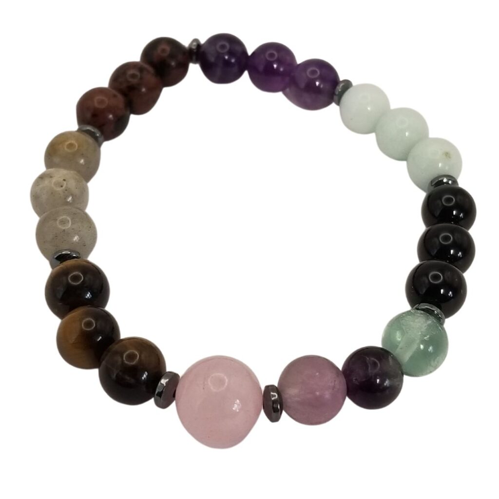 22 bead bracelet made with 8mm fluorite, tiger’s eye, black onyx, labradorite, mahogany obsidian, amazonite, and amethyst beads and 1-10mm rose quartz bead with hematite accents, approximately 8 inches long.