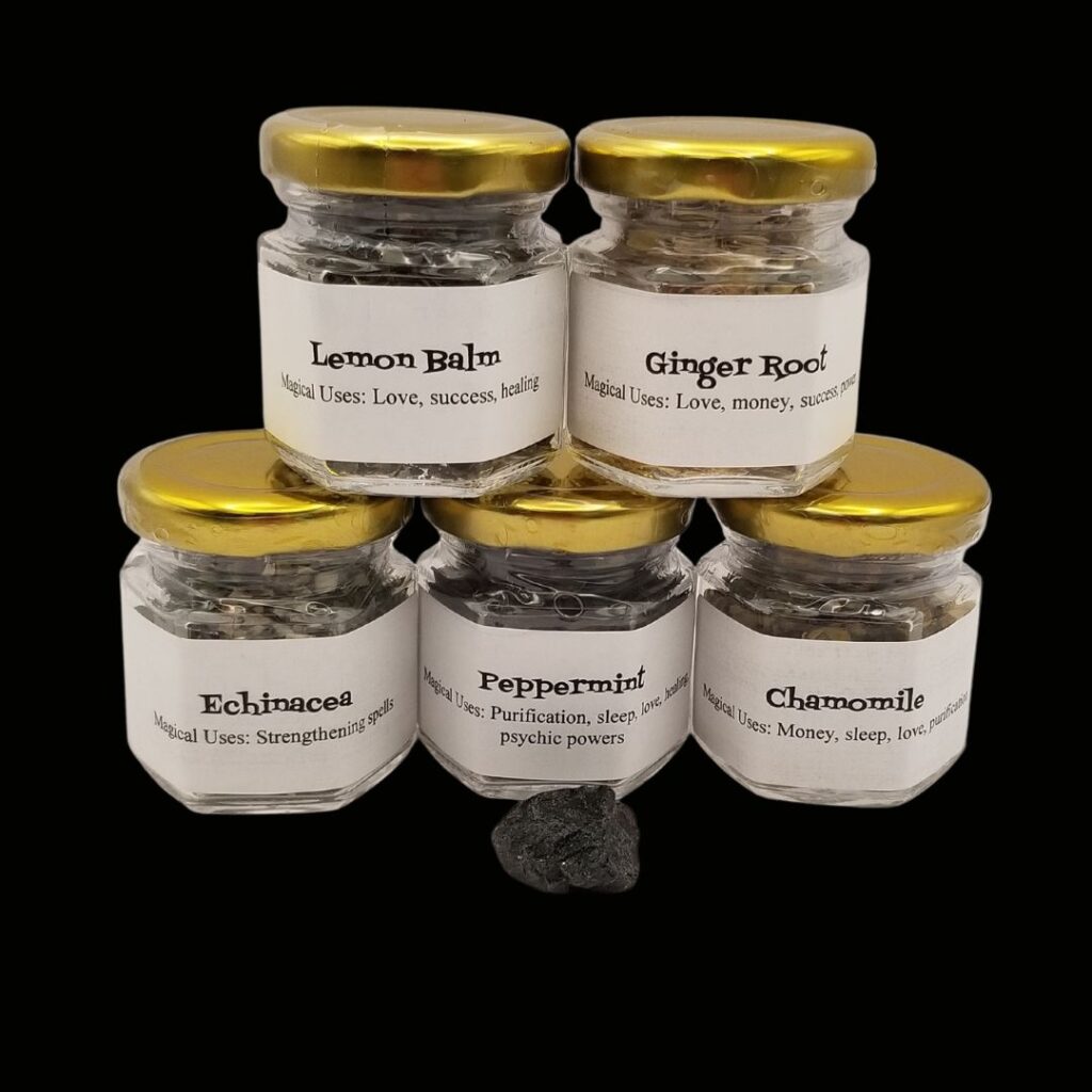 Herb Kit 2 contains 1.5 ounce jars of echinacea, lemon balm, ginger root, peppermint and chamomile. Also contains 1 black tourmaline.