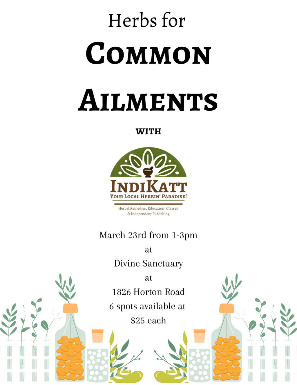 Join us on Sunday, March 23, 2025 from 1 pm to 3:00 pm for Indikatt’s Herbs for Common Ailments make and take class!! $25 covers the cost of your materials for this two hour adventure. (Maximum 6 spots available.)