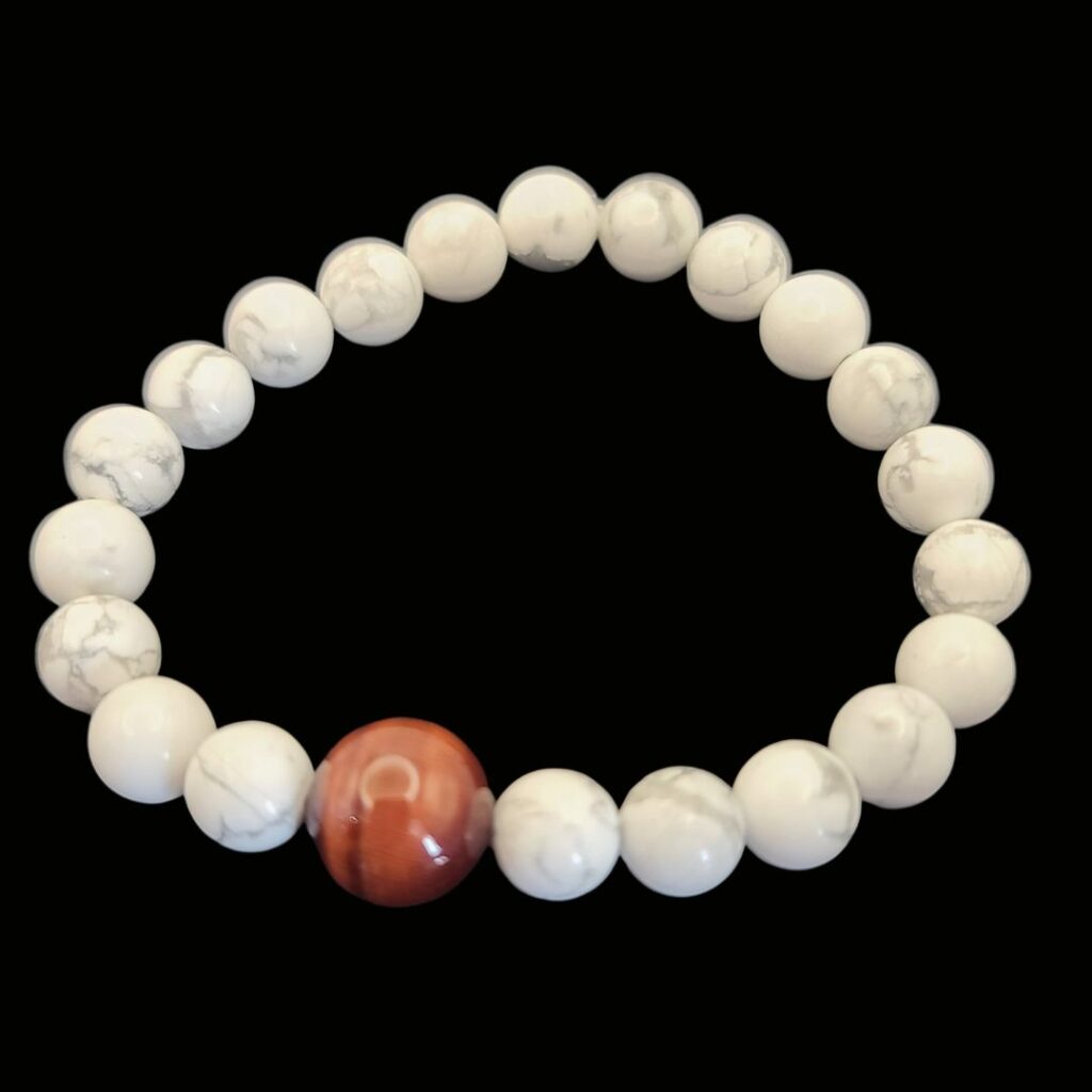 Bracelet made with howlite and red tiger eye beads, approximately 8 inches.