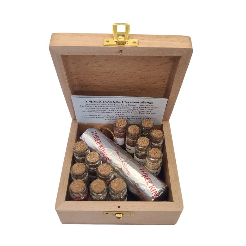 This kit contains all the Indikatt Productions powdered incense blends, along with a package of self-igniting charcoal and goddess keychain spoon in a convenient wooden box. Also includes cards listing all of the herbs in the various incenses. Incense bottles include: Samhain, Yule, Imbolc, Ostara, Beltane, Lammas, Litha, Mabon, New Moon, Full Moon, Abundance/Success, Peace/Wisdom, and Protection.