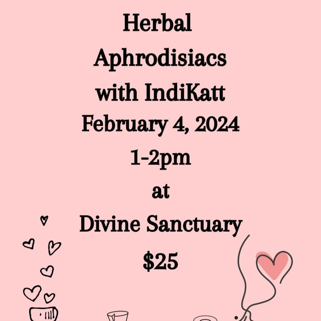 Join us on Sunday, February 4, 2024 from 1 pm to 2:00 pm and learn about Herbal Aphrodisiacs with Indikatt Productions!! $25 covers the cost of your materials for this one hour adventure. (Maximum 8 spots available.)