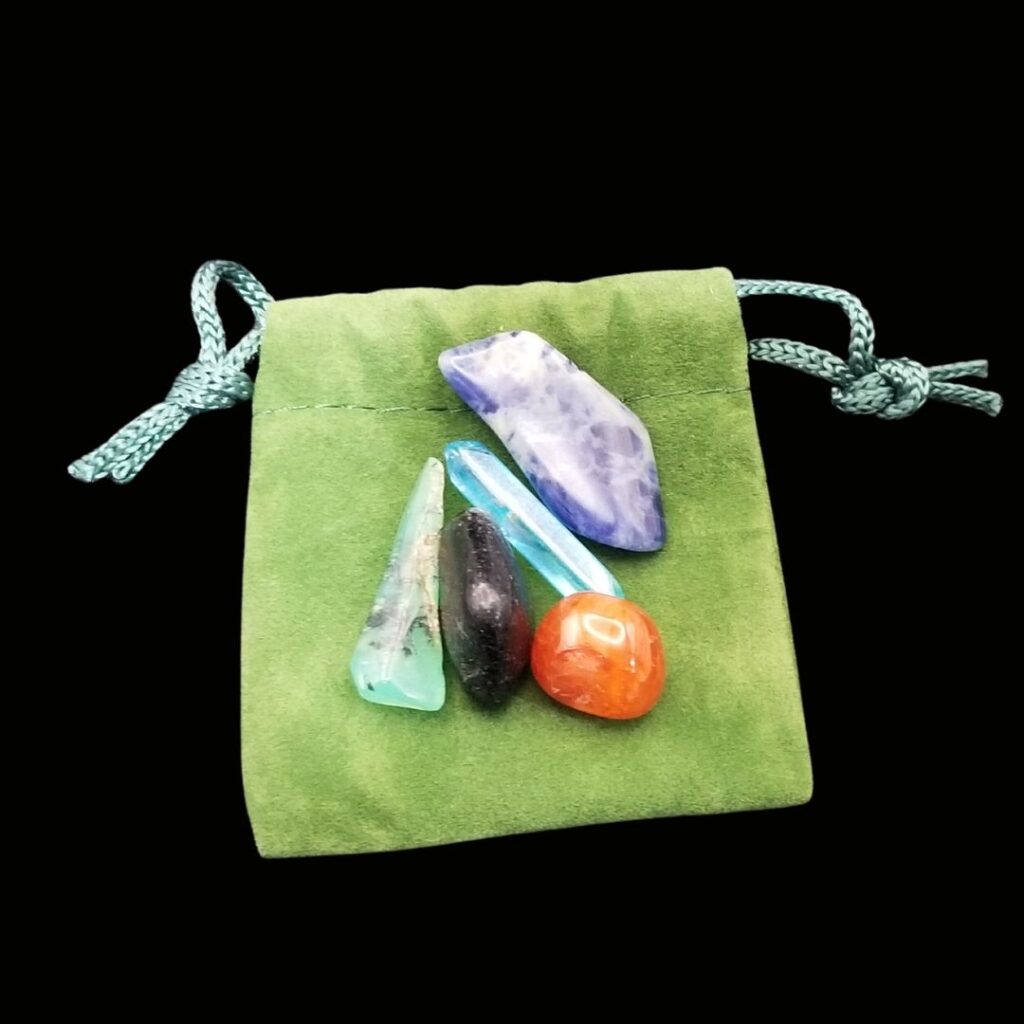 Love Boost stone kit. These stones will help ehance unconditional love and communication, assist domestic bliss, release negative energies from the auric field, repel psychic attacks, restore vitality and motivation, dispel apathy, promote positive life choices and rational thought/objectivity, overcome abuse, and verbalize feelings. It also opens, activates and energizes the heart and sacral chakras. Also includes small velvet bag.