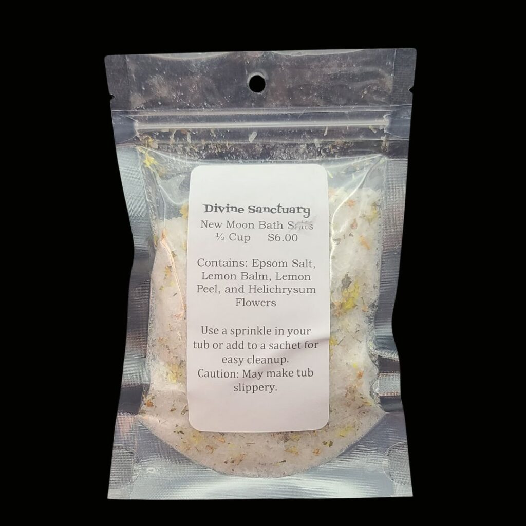New Moon bath salts contain epsom salt, helichrysum flowers, lemon peel and lemon balm.