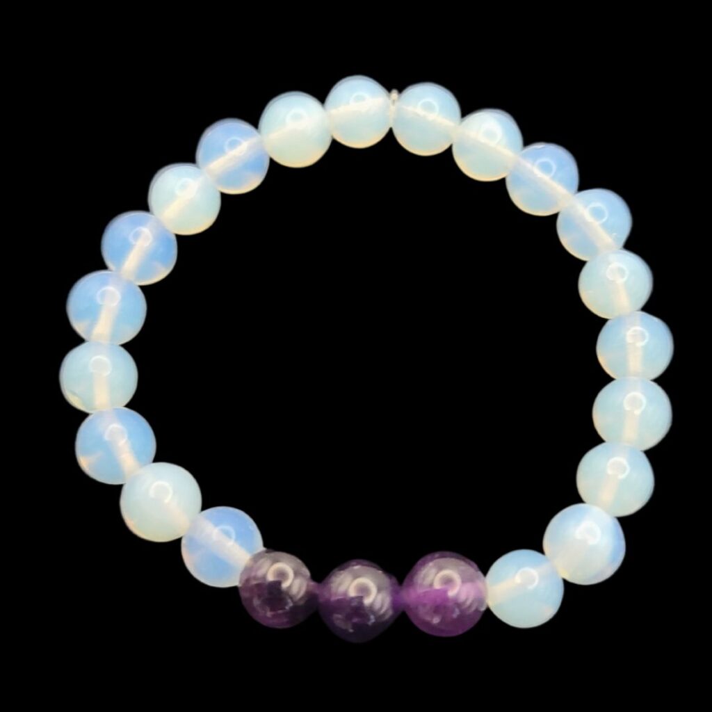 Bracelet made with opalite and amethyst beads, approximately 8 inches.