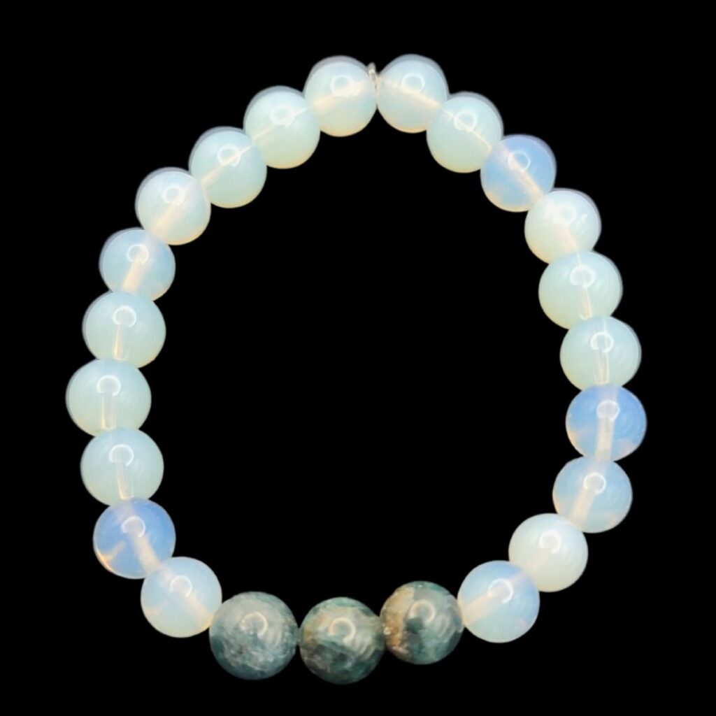 Bracelet made with opalite and apatite beads, approximately 8 inches.