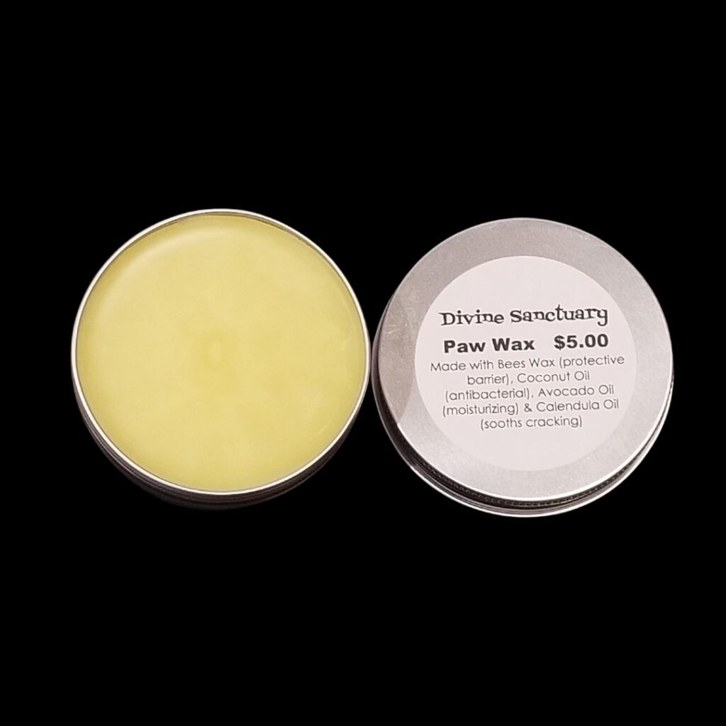 Approximately 2 oz. of homemade paw wax that I use for my dog. I put it on his paws for relief. It will help protect your pet’s paws from the snow, ice and chemicals (or salt) put down for de-icing purposes in the winter. It also helps heal and provide relief for cracked paws from the cold or the heat of summer sidewalks. It is completely natural and safe, even if your pet is more interested in licking it off their paws.