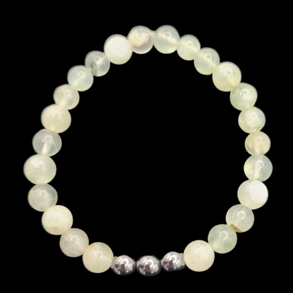 Bracelet made with prehnite and hematite beads, approximately 8 inches.