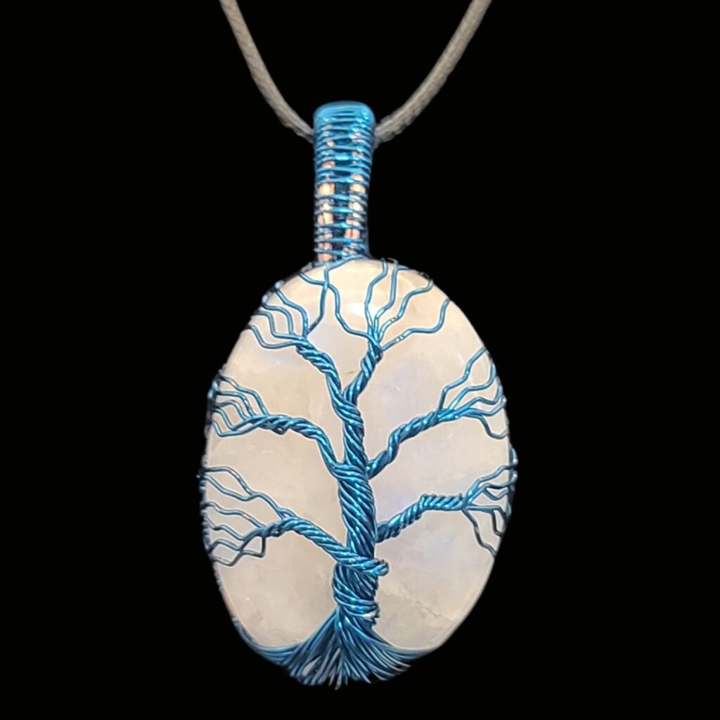 Rainbow Moonstone wrapped with a blue tree of life. All tree of life pendants will come with an adjustable cord. The large tree of life pendants are approximately 35mm x 45mm.