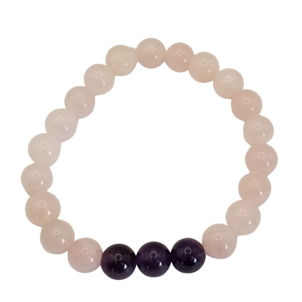 Bracelet made with rose quartz and amethyst beads, approximately 8 inches.