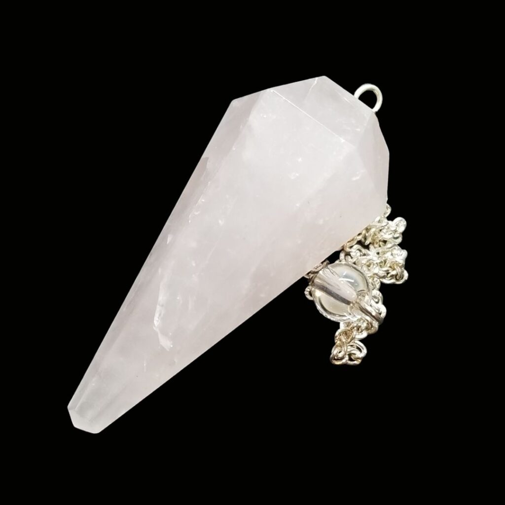 Rose Quartz pendulum, approximately 8″ from tip to tip.