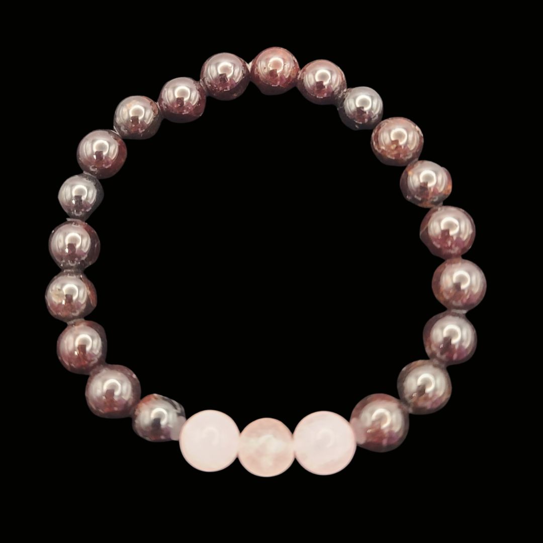 Bracelet made with ruby garnet and rose quartz beads, approximately 8 inches.