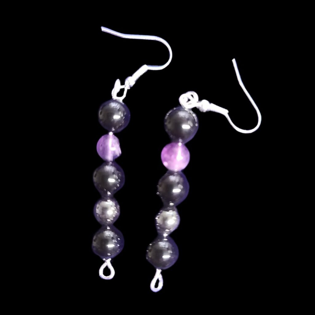Saturn Retrograde Earrings made with amethyst, hematite and black onyx beads.